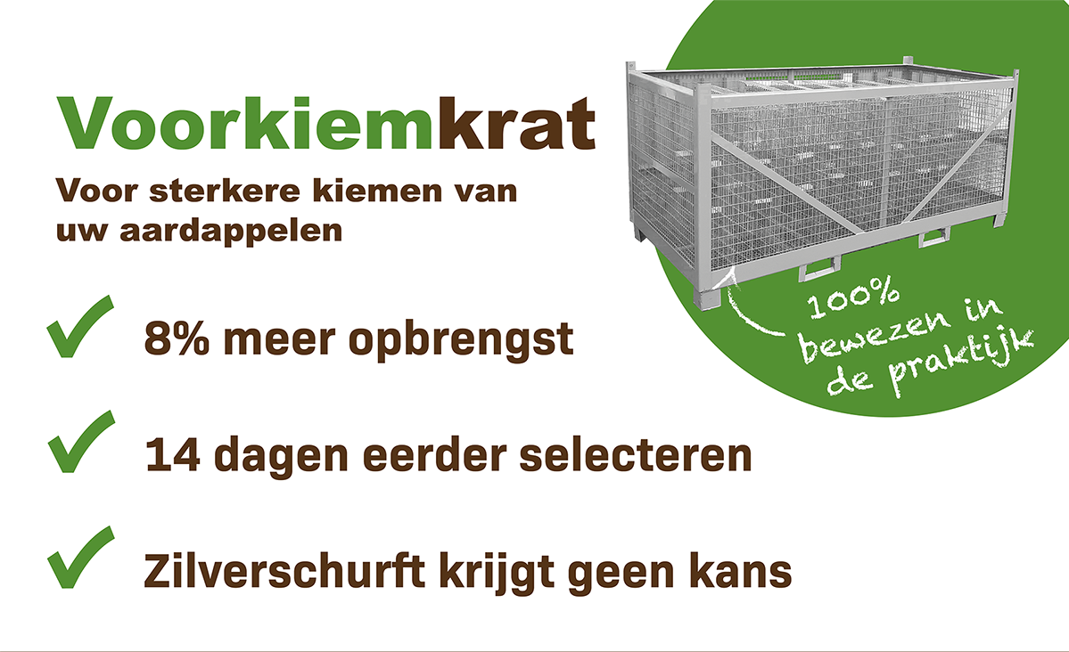 Met de voorkiemkrat zorg je automatisch voor een goed kiemproces. De aardappelen komen door het ontwerp van de krat beter in het licht, waardoor je gemakkelijk korte en stevige kiemen krijgt. Ook kan de voorkiemkrat gedraaid worden met een aangepaste kistendraaier. Je kunt het kiemproces dus beter sturen. Naast een betere oogst zorgt de voorkiemkrat ook voor een efficiënter werkproces:
